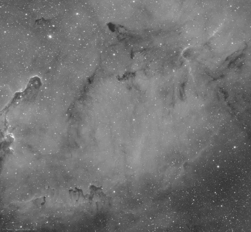 Here’s a reasonably processed stack of 71 subs of IC 1396 in the Constellation Cepheus, cropped to show some of the Elephant’s Trunk Nebula (structure on the left) and the clouds and filaments of dark interstellar dust (B161 is the large dark blob with wispy strands blowing off it toward the top) that drift in front of this massive region of ionized hydrogen—all that lighter gray stuff, basically everything in this frame except where it begins to thin out in the lower right. By “massive” I mean it spans 3 degrees in the sky. To put this size in perspective, the angle covered by our full moon is about 31 arcminutes or 1/2°. IC 1396 is 3° or 6 times the diameter of a full moon. And it really stands out in narrowband!