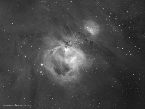 Orion is back in the sky! Sure, you have to get up at 3 in the freakin’ morning to see it with your own eyes. Or you can program your astro imaging system to stay up all night and take pictures without you. Here’s M42, Orion Nebula, along with M43, De Mairan’s Nebula–that’s the spherical-looking cloud formation with the big bite taken out of it. And above that, shining brightly, Sh2-279 Running Man Nebula–although the famous running man shape isn’t clear in hydrogen alpha. It really comes out with oxygen III and sulfur II. I’ll come back another night to capture the OIII and SII frames. Notes: 31 x 240 second exposures in Ha + 20x 10 second subs just for the Trapezium (the super bright core of the Orion Nebula–so bright I have to take separate short exposure shots and merge it back in processing). https://SaltwaterWitch.com