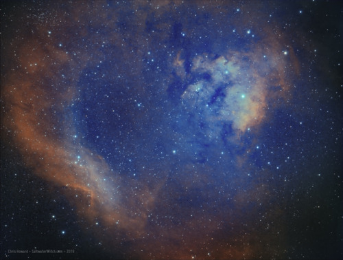Imaging notes: William Optics GT81 at f/4.7 with WO 0.8x Flat6A II, Astronomik Ha, OIII, SII 6nm filters, Moonlite focuser, ZWO ASI Cameras ASI120MM OAG, Imaging camera: ZWO ASI1600MM Pro cooled mono on an Orion Atlas EQ-G mount. Stacked in DSS, processed in PS CC 2019. 40 x 120 second exposures for each filter.