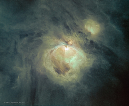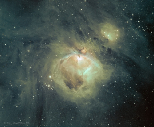 Orion Nebula (M42) in the SHO Hubble Palette - with and without stars - I have been thinking about how to represent false-color imaging for deep sky objects, and I’ve been keeping more of that abundant hydrogen green in the mix when doing SHO Hubble Palette images, where we map Sulfur, Hydrogen, and Oxygen bandpasses to Red Green Blue (RGB). Because hydrogen is–by a wide margin–the most abundant element in the universe, and many of these nebulae are HII Regions (vast expanses of interstellar atomic hydrogen that’s ionized), there ought to be way more green in SHO images than we normally see. It’s become standard go heavy on a rust red and deep blue, with almost of the green removed. All of these color choices are esthetic choices. The images I’m posting come from the data from three separate filters, Ha, OIII, and SII, so in a sense there are no incorrect color levels–within reason.