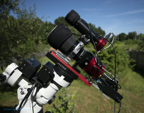 Here’s my test setup for tonight–testing the DIY Pocket Powerbox. This is my ZWO ASI071MC with a Nikon 180mm f/2.8 lens, ZWO ASI120MM-S + 130mm guiding, on my trusty old iOptron CEM25P mount. That’s my prototype pocket powerbox on the back, behind the main imaging camera. I’m going to be doing some long exposure color shots in Vulpecula–Sh 2-92, NGC 6820.
