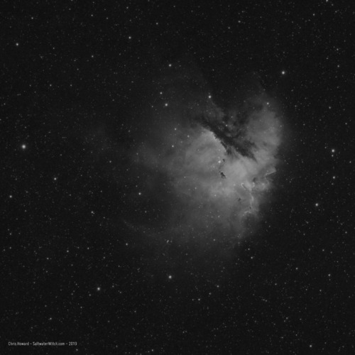 NGC 281, called the Pacman Nebula for obvious reasons is an HII region in Cassiopeia. Pacman has some amazing features including a batch of really distinct Bok Globules, those small dark nebulae full of cosmic dust that may be playpens for newborn stars. William Optics GT81, #ZWO ASI1600MM-Pro, #Astronomik Ha 6nm filter, 30 stacked 3 minute exposures, no calibration frames. Work in progress from last night’s imaging run. https://SaltwaterWitch.com