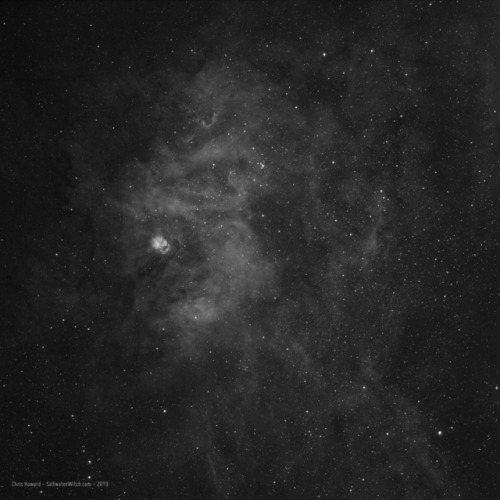 One more from Monday’s narrowband imaging run. Nebula Sh2-54 is about 5000 lightyears away in the constellation Serpens. It’s part of a long band of nebulosity that extends almost ten degrees through the Eagle Nebula (M16) and Swan/Omega Nebula (M17) beyond that. NGC 6604 is the cluster of stars above and to the right of the brightest knot of the nebula. This is the final target from Monday’s imaging run. Imaging notes: William Optics GT81, ZWO ASI1600MM-Pro, Astronomik Ha 6nm filter, 30 stacked 3 minute exposures, no calibration frames. https://SaltwaterWitch.com