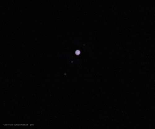Our moon is especially beautiful and bright tonight. Notes: AstroTech 6" Ritchey–Chrétien f/9 1350mm, Nikon D750 32 x 1/500 sec, ISO 3200, stacked in AutoStakkert 3.0.14. What’s cool, is Jupiter is just up along the ecliptic from the moon, and I swung the same setup there and captured a very dim shot of our system’s largest planet along with three moons, Europa, Io, and Ganymede.