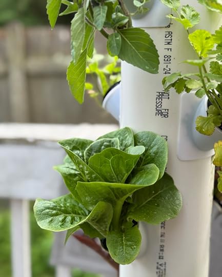 Lettuce, Thai Basil, and Cilantro growing in the homemade hydroponics tower on the back deck. I…