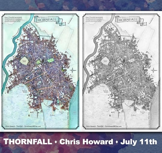 MAPS! I have maps! It took nearly seven months to get this right. I wanted a vintage watercolor look to give it the feel of a hand-tinted plate torn from the pages of an old history book. There are a few more place and street names to add, but I couldn’t wait to share the latest map of the town of Thornfall. The color map will go in the ebook and grayscale will go into the print editions. https://ChrisHowardWriter.com