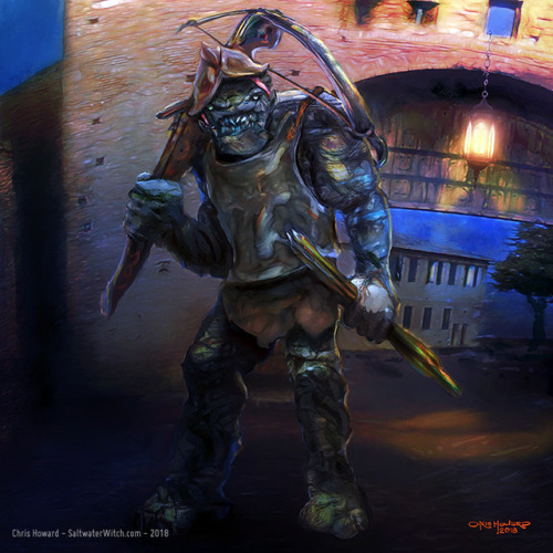 Sergeant Detritus of the Ankh Morpork City Watch. Another one of my favorite Terry Pratchett characters. Detritus is a troll who’s pretty green as we follow him through the book Men at Arms, but he’s already a sergeant in Feet of Clay. One of the weapons he favors is a repurposed siege crossbow named the “Piecemaker” that he’s modified to shoot multiple bolts at once.