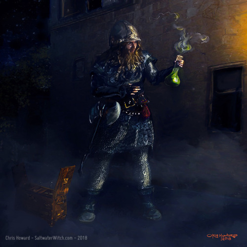 We first meet Sam Vimes as a miserable Night Watch captain in Guards! Guards!, when he’s scrambling to keep his sanity as a lowly copper, when all he has are the scraps that remain after the guilds and nobles have divided up the wealth and decided what law and order will look like. As you’d expect, it’s been beaten into a shape that best suits them. He’s often drunk, unable to do his job, haunted by the deeds of his ancestors, but if you stick with Vimes, you see that he knows the streets of his city like few others, he understands the workings and motives of the Ankh-Morpork guilds and aristocracy like an insider, although he will never be one. Above all, he’s just a good guy who has never had it easy, but who has taken the opportunity to learn something at every turn, from his humble beginnings to his marriage to the most powerful woman in the city. We can always rely on old Vimes. We can rely on his solid moral core, and even the need to “go spare” when it’s necessary. That’s Sir Samuel Vimes, Commander of the Ankh-Morpork City Watch, Duke of Ankh–also known by the lofty title, Blackboard Monitor. He’s another one of my favorite Terry Pratchett characters–he may be my favorite, although I’m very fond of Granny Weatherwax. This time I’ve painted the mountain pass scene in The Fifth Elephant, when Sam, Sybil, and party are waylaid by bandits. Vimes has other plans, and he has three tools he can use: the one-shot assassin’s weapon he confiscated from Inigo Skimmer, a cigar, and a match to light it.