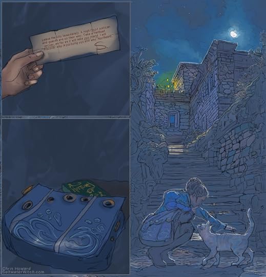 I just finished up a couple introduction panels to go with the character studies yesterday–and by “finished” I mean still quite rough with some sloppy line work, but a good start. The main character has a “sea-bag”, which she uses on cargo voyages, and I probably spent too much time sketching ideas to make it look different and interesting. More of my stuff here: https://SaltwaterWitch.com