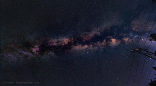 Our galactic neighborhood in 13 stacked 15 second exposures, Nikon D750, Rokinon 10mm f/2.8 lens. What’s crazy is this with a decent DSLR camera, lens, a tripod, and some free image stacking software (DSS). I did the stretching in Photoshop CC–“stretching” is when you adjust contrast, intensity values, to bring out the features of whatever you’re shooting–in this case the north end of the Milky Way Galaxy, our home. Let me point out some interesting features: starting at the left, that vivid red star is the “Garnet Star” (Mu Cephei), and that’s right next to some cool nebulosity that includes the Elephant’s Trunk Nebula (IC 1396), a little ways along, you see that blocky reddish region? That’s the North America Nebula (NGC 7000) with the star Deneb (19th brightest star in the night sky). Deneb forms the northernmost (leftmost in this shot) point of the famous “Summer Triangle”. The other two points are Vega, the 5th brightest star in the night sky (to the right and above the Milky Way core in this shot), and Altair (12th brightest) a little more to the right and below the Milky Way core. Moving along the galaxy, just left of where the powerlines cross, those grayish-pink cloudy areas? That’s where you will find the Eagle Nebula (Messier 16, NGC 6611) and the Swan Nebula (M17). That bright point of light in the middle of the powerlines is the planet Saturn, which is moving along the ecliptic and right now it’s in a pretty good place for viewing. Just right of that are a few more cloudy areas. That’s where you would look for the Lagoon Nebula (M8, NGC 6523) and Trifid Nebula (M20, NGC 6514). Somewhere along the Milky Way–this is where you will mostly likely find me focusing my telescope all the through the summer and fall. I almost see this shot as a map of places to visit from afar, and the cool thing is you really don’t need to setup the astro gear for this. You can create your own galaxy map, as long as your camera can handle long exposures (only 15 seconds) and you have it on a tripod with a remote shutter control.  http://SaltwaterWitch.com/astronomy
