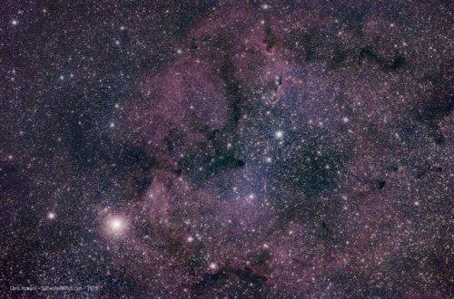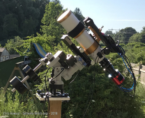 In my last post I walked through a long stretch of the Milky Way, our galaxy, and at the far left of the shot was part of the constellation Cepheus with a “vivid red star” called the “Garnet Star” (Mu Cephei), and that was right next to some cool nebulosity that includes the Elephant’s Trunk Nebula. Well here’s what that region looks like up close in RGB color. (You should see it in narrowband!). I took 21 x 300 second (5- minute) exposures, running the sensor at -10°C, stacked them in DSS, and processed them in Photoshop CC 2018. That’s Mu Cephei in the lower left, and middle top you can see the Elephant’s Trunk Nebula. Also including a pic of my setup for this shot– #WilliamOptics GT81 APO refractor and a #ZWO ASI071MC cooled color astro camera.