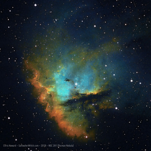 Here’s NGC 281 (“Pacman Nebula”) in the Hubble Palette (SII, Ha, OIII -> RGB). NGC 281 is an emission nebula, about 9,200 lightyears away in the constellation Cassiopeia. I re-stacked and reprocessed some hydrogen-alpha, oxygen-3, and sulphur-2 image data I shot several months ago, and I’m happier with this latest result than I was then. It’s called the Pacman Nebula because it sort of looks like the classic video game character. (6 x 1200 second exposures in Ha, 5 x 1200 sec OIII & SII with 16 dark frames, Atik 414EX mono CCD, Astronomik 6nm Ha, OIII, SII, William Optics GT81, CEM25P EQ mount, WO 50mm guidescope with ZWO ASI120S-MM guide cam, INDI/KStars/Ekos observatory control).