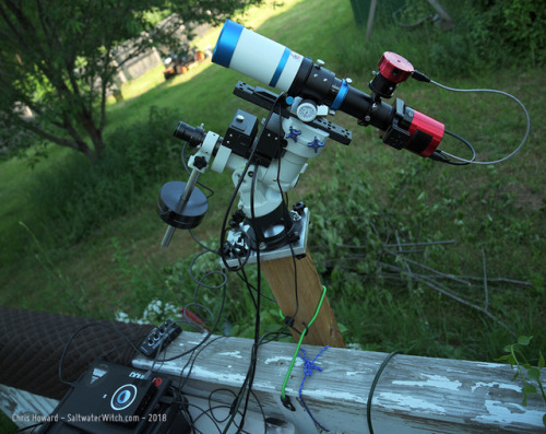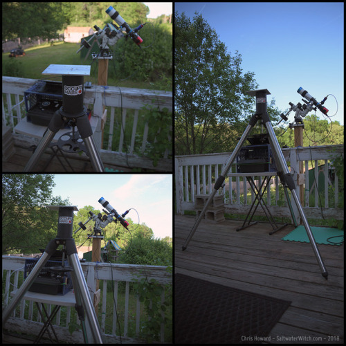 The pier-baseplate-on-the-tripod project is complete, and tonight’s slogan is “Summer: portable, Winter: pier” (a slogan typically means “a short and striking or memorable phrase used in advertising”, but you can probably tell I’m using it in the historic “Scottish war cry” sense here). The skies look clear this evening, and I’ll still be using the William Optics ZS61 on the “pier”, which stands just off the back deck. I set this up last fall so that I could do my astro stuff through the winter, and not have to lug a lot of heavy, expensive equipment through snow and ice, and all winter long I’ve been carrying my EQ mount, scope, and counterweights five steps out the back door to set it down and bolt it to the aluminum baseplate. It was easy and I could ready to go in a few minutes. Well, it’s almost time to move the whole operation further from the house. See the shed in the background there? This time of year, and through the autumn, I usually work off the tripod out there, about 120 feet/36m from the house. This gives me a lot more sky east of the meridian–a lot more than the view from the deck, which has a tree obstructing things to about 45° to the northeast, and I can only reach 10-15° past the meridian to the south. So, it’s almost time. I’m ready with my portable tripod (with the pier plate). I’m ready to shout that war cry to summer night sky: “SUMMER PORTABLE!”