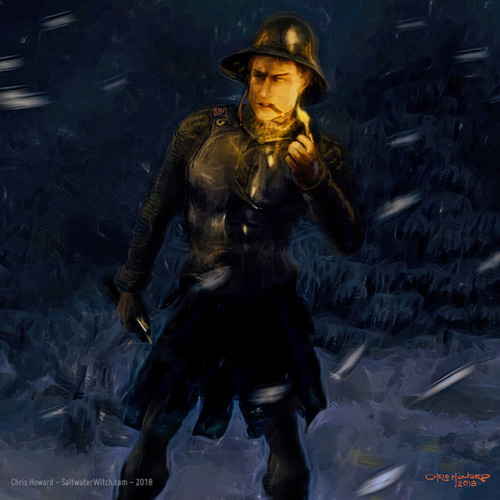 We first meet Sam Vimes as a miserable Night Watch captain in Guards! Guards!, when he’s scrambling to keep his sanity as a lowly copper, when all he has are the scraps that remain after the guilds and nobles have divided up the wealth and decided what law and order will look like. As you’d expect, it’s been beaten into a shape that best suits them. He’s often drunk, unable to do his job, haunted by the deeds of his ancestors, but if you stick with Vimes, you see that he knows the streets of his city like few others, he understands the workings and motives of the Ankh-Morpork guilds and aristocracy like an insider, although he will never be one. Above all, he’s just a good guy who has never had it easy, but who has taken the opportunity to learn something at every turn, from his humble beginnings to his marriage to the most powerful woman in the city. We can always rely on old Vimes. We can rely on his solid moral core, and even the need to “go spare” when it’s necessary. That’s Sir Samuel Vimes, Commander of the Ankh-Morpork City Watch, Duke of Ankh–also known by the lofty title, Blackboard Monitor. He’s another one of my favorite Terry Pratchett characters–he may be my favorite, although I’m very fond of Granny Weatherwax. This time I’ve painted the mountain pass scene in The Fifth Elephant, when Sam, Sybil, and party are waylaid by bandits. Vimes has other plans, and he has three tools he can use: the one-shot assassin’s weapon he confiscated from Inigo Skimmer, a cigar, and a match to light it.