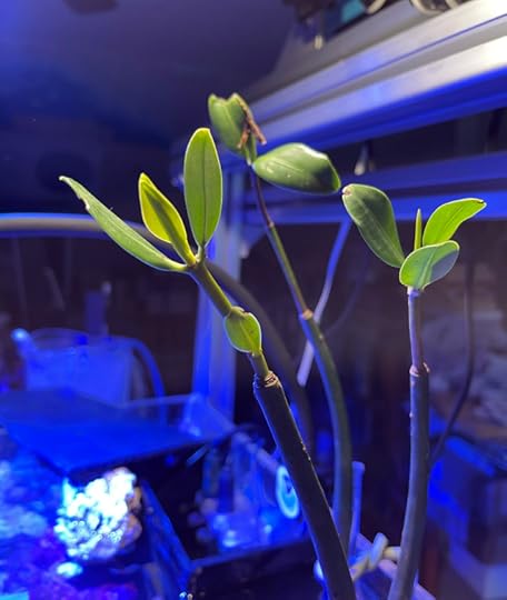 I love my clownfishes but I’m mainly here for the invertebrates–the corals, mollusks, worms, arthropods, and the ecosystem. The Pencil Urchin was out and about this morning–just caught him with the camera. As soon the lights came up, he crawled back into his burrow. Info: probably a Slate Pencil Urchin (Eucidaris tribuloides) from the Caribbean. I have to keep an eye on this guy. He mainly feeds on sponges with the occasional coral meal. I have quite a bit of encrusting sponge (orange patch toward the top center) and the undersides of other rocks.