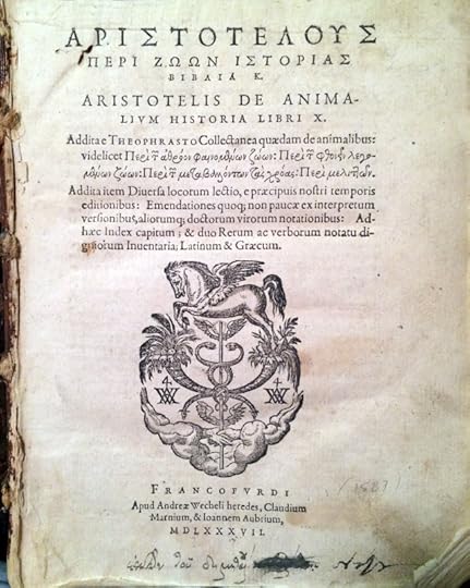 Title page image from my library: Aristotle’s Historia Animalium (Aristotelous Peri Zoon Historias Biblia 10) Edited by Friedrich Sylburg, published in Frankfurt, 1587, Apud Andreae Wecheli heredes, Claudium Marnium, & Ioannem Aubrium.