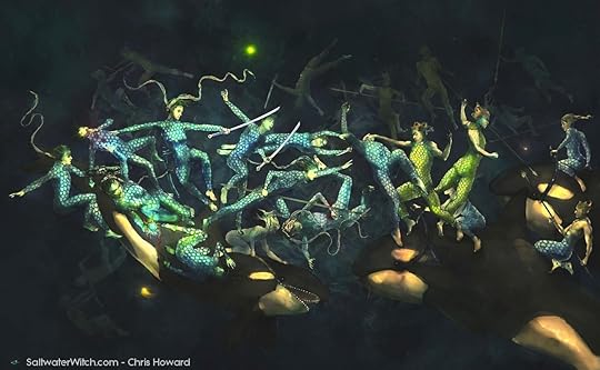 Here's a painting I'm working on, a really big complex thing with a bunch of figures--seaborn and orcas--engaged in underwater combat. Still a ways to go, but here's a detail and a much reduced version of where things stand at the moment. So far about twenty hours of work, mostly in Sketchbook Pro and Art Rage, but I've also incorporated sketches from Brushes and Sketchbook on my iPad. I'm about halfway done. So much detail in this one.
