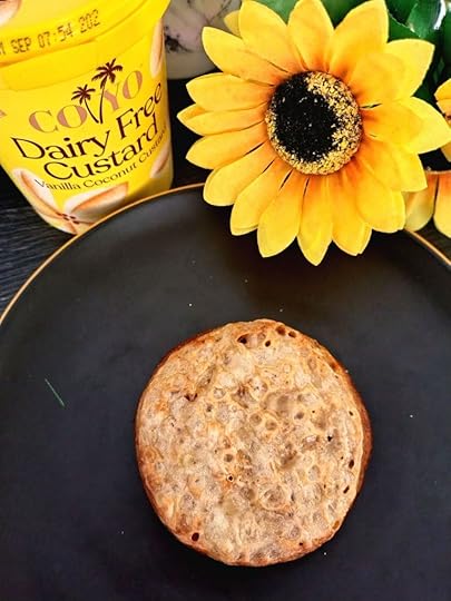 1.) Pour 2 tbsp’s of custard on the crumpets, using a butter knife to slowly press the custard into the holes.