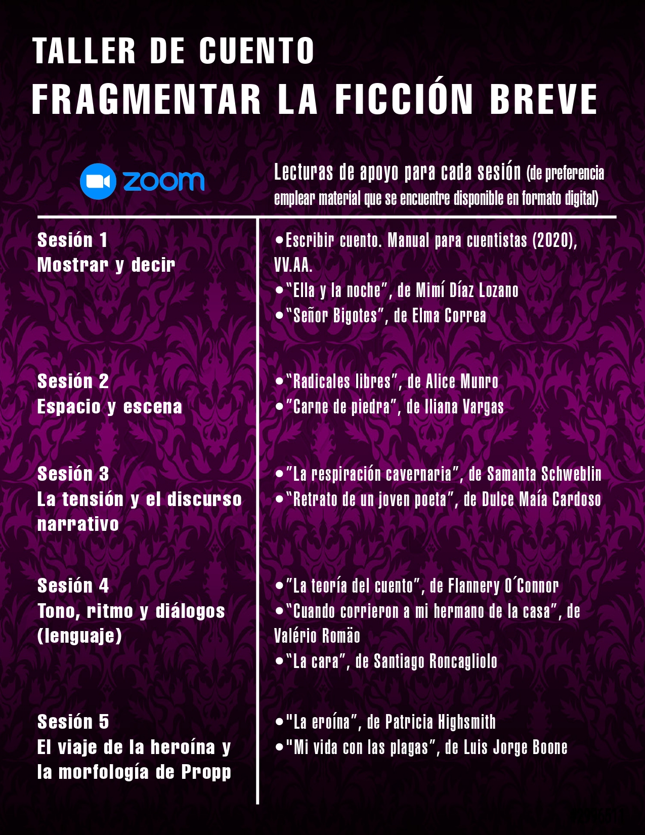El próximo lunes 18 de octubre, a las 6 p.m., inicia mi Taller de cuento II - Fragmentar la ficción breve, organizado por Sonia Higuera (coordinadora de la plataforma cultural Tejiendo Historias). Constará de 5 sesiones virtuales por Zoom, de 2 horas cada una, en las que analizaremos nuevos temas teóricos y textos de ficción, así como las obras de los participantes.