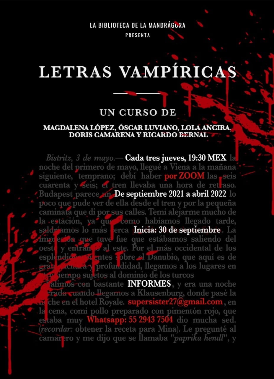El próximo 30 de septiembre iniciará el curso virtual «Letras vampíricas», coordinado por Ricardo Bernal y Doris Camarena en el espacio cultural La Biblioteca de Mandrágora.