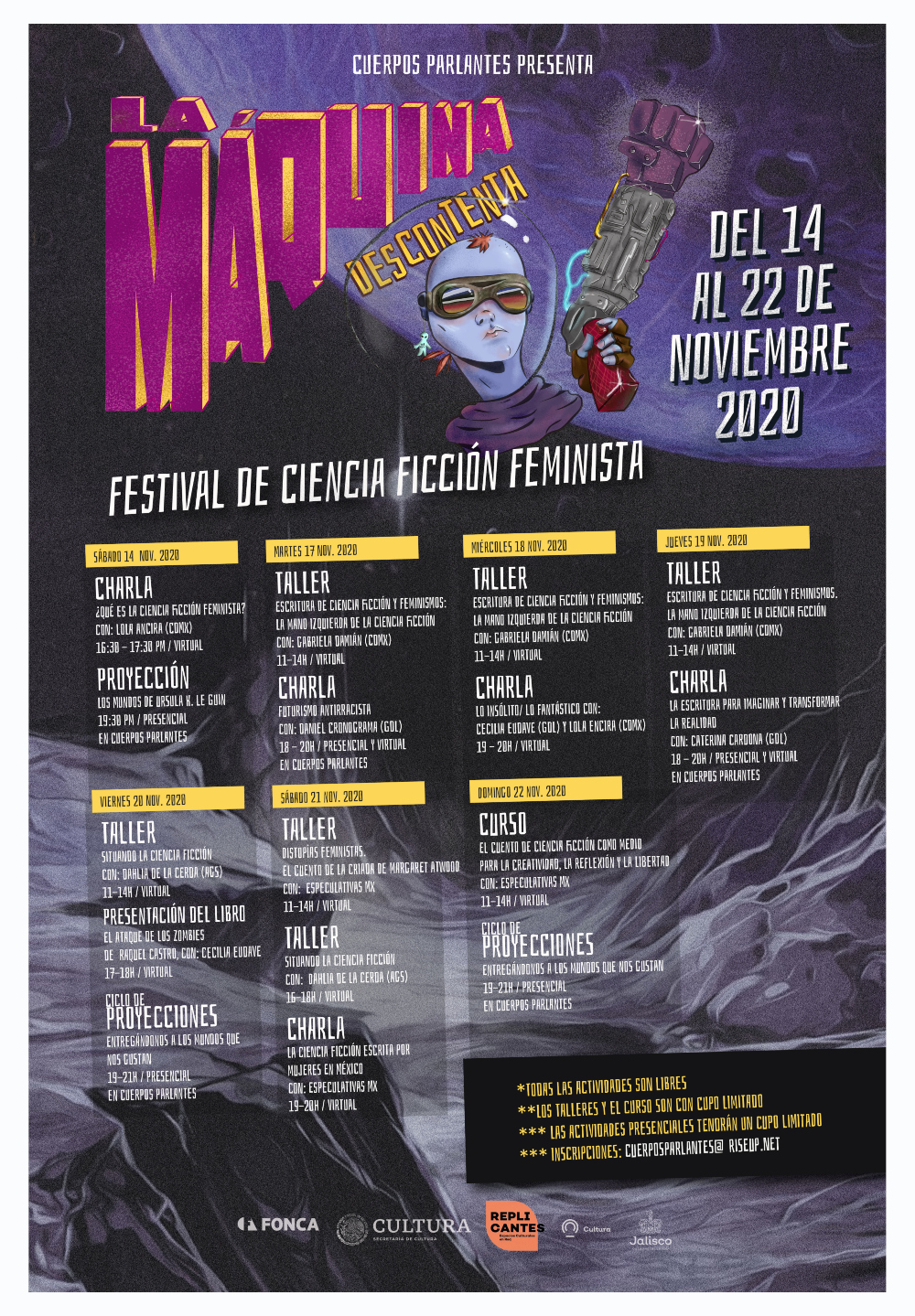 ¡Del 14 al 22 de noviembre se realizará (tanto de manera virtual como presencial) La Máquina Descontenta, el primer festival enfocado en la ciencia ficción feminista! Este increíble festival es organizado por por la colectiva Cuerpos parlantes, y tendré el honor de inaugurarlo con la charla “¿Qué es la Ciencia Ficción Feminista?” mañana, sábado 14 de noviembre, a las 16:30 horas.