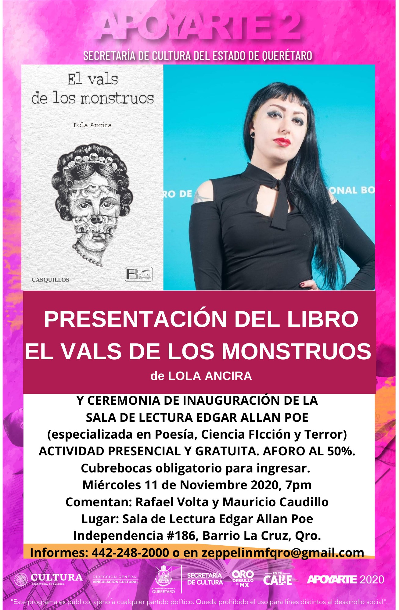 Este miércoles 11 de noviembre a las 7:00 p.m. inauguraremos la Sala de lectura Edgar Allan Poe y presentaremos la reedición de mi libro de cuentos El vals de los monstruos en Querétaro. Los comentarios estarán a cargo de Rafael Volta y Mauricio Caudillo.