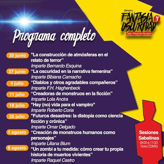 La primera sesión estará a cargo de Bernardo Esquinca, que hablará sobre "La construcción de atmósferas en el relato de terror". La siguiente, la impartirá Bibiana Camacho: "La oscuridad en la narrativa femenina". Yo impartiré la cuarta, "Creadoras de monstruos en la ficción". La última, estará a cargo de Raquel Castro: "Un zombi a tu medida: cómo crear tu propia historia de muertos vivientes".