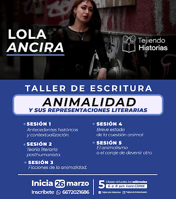 No te pierdas el taller virtual "Animalidad y sus representaciones literarias" con la escritora Lola Ancira.