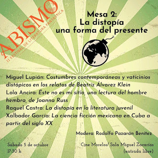 Yo tendré el gusto de participar el sábado 5, junto con Miguel Lupián, Raquel Castro y Xalbador García, en la Mesa 2: «La distopía, una forma del presente» con el texto «Éste no es mi sitio, una lectura de El hombre hembra de Joanna Russ», el sábado 5 a las 17:30 horas en la sala Miguel Zacarías del cine Morelos. También, el mismo día, en la lectura de cuentos fantásticos a las 21:00 horas en el café La fauna, junto con Ave Barrera, Omar Nieto y Raquel Castro.