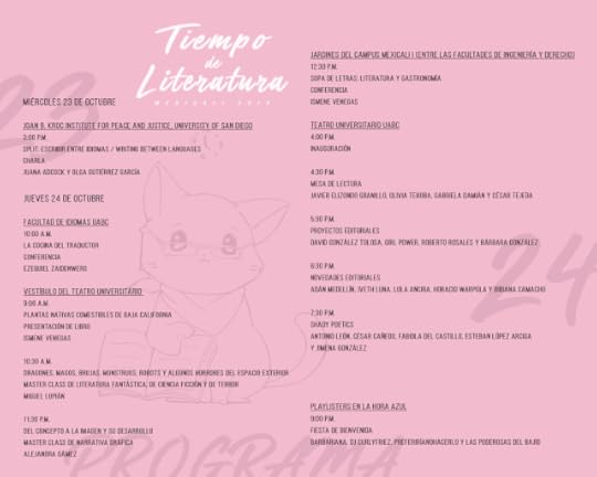 El encuentro Tiempo de Literatura 2019, coordinado por la escritora Elma Correa (autora del libro de cuentos Que parezca un accidente [Nitro/Press, 2018]) y un equipo que incluye a los también escritores y gestores culturales Samantha Luna, Antonio León, Zeth Arellano, Karla Michelle Canett e Ivonne Prieto en colaboración con instituciones educativas y culturales como la UABC, el Cetys Universidad y el ICBC, se realizará los próximos 24, 25 y 26 de octubre en Mexicali, Baja California.