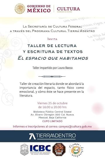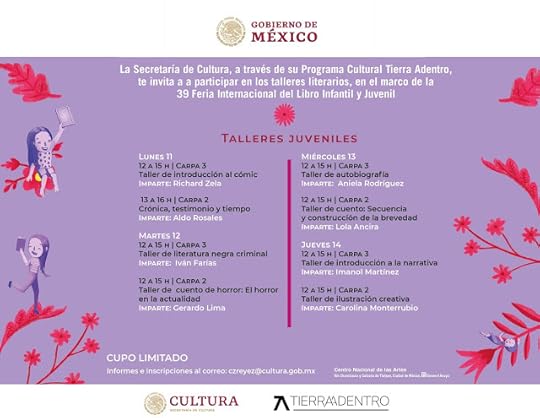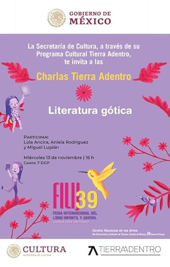 Este año tendré el gusto de participar con el programa de la editorial Tierra Adentro el miércoles 13 de noviembre con un taller de cuento a las 12:00 del día (gratuito) y una charla sobre literatura gótica a las 16:00 horas junto con Miguel Lupián y Aniela Rodríguez.