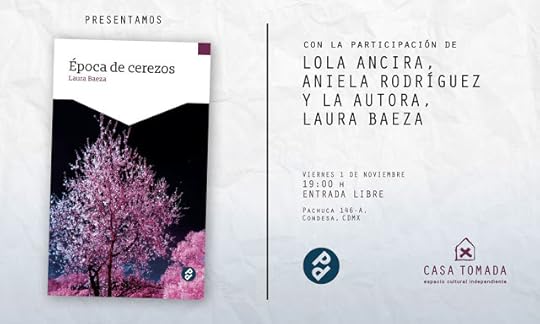 Mañana, viernes 1 de noviembre, presentaremos Época de cerezos (Premio Nacional de Narrativa Gerardo Cornejo 2017, publicado por Editorial Paraíso Perdido recientemente), libro de cuento de Laura Baeza, en Casa Tomada.