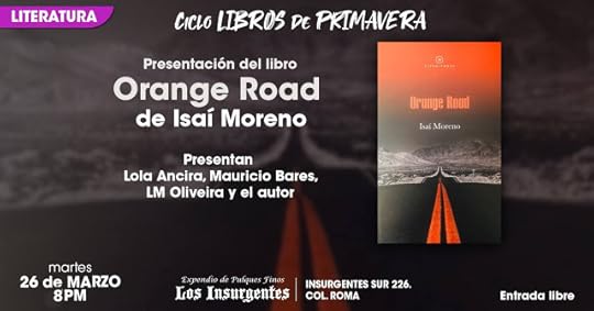 Mañana, Mauricio Bares, L. M. Oliveira y yo tendremos el honor de presentar Orange Road, novela de Isaí Moreno galardonada con el Premio Nacional de Novela Corta Juan García Ponce 2016 y publicada recientemente por la editorial Nitro/Press. La cita es en la Pulquería Los Insurgentes a las 20:00 horas.