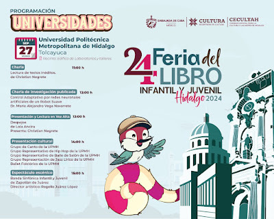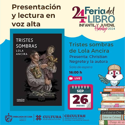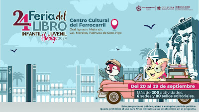 ¡Nos vemos este jueves y viernes en la 24 Feria del Libro Infantil y Juvenil Hidalgo 2024, de la Secretaría de Cultura de Hidalgo! Christian Negrete y yo presentaremos _Tristes sombras_ mañana a las 4 p.m. en el Centro Cultural del Ferrocarril, y el viernes presentaremos _Despojos_ a la 1 p.m. en la Universidad Politécnica Metropolitana de Hidalgo.