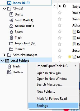 Install Mozilla Thunderbird on your system and create a new account.After the account is set up, right-click Local Folders.In the menu that opens, click Settings.