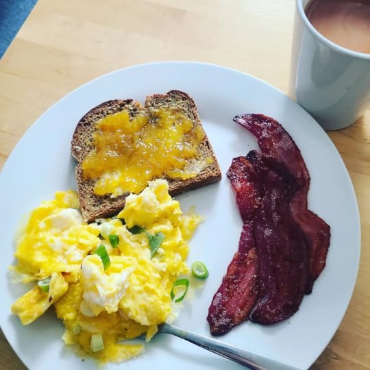 After the previous day's abysmal cooking, I was glad to see I still had the touch. I made a breakfast of scrambled eggs with green onion, bacon, and brown bread with marmalade.