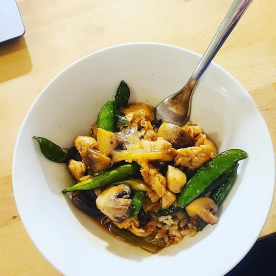 A stir fry with chicken, peapods, mushrooms, and green onion in a soy ginger sauce over brown rice shouldn't have been difficult but it was... Not great. Lol