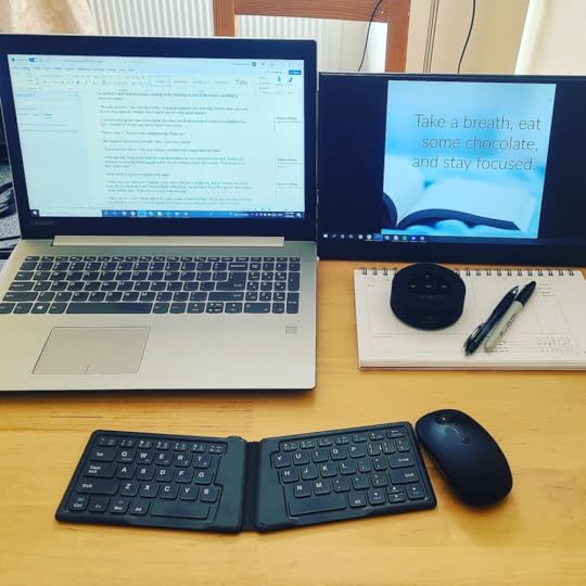Today was another writing day. I made progress on my hockey story and got to work on plans for promoting it when it releases in late February. I also updated an old free book I have (more on that soon!) and did some more editing. All of which was helped by the fact that I brought a portable second monitor with me. It's roughly the same size as my laptop (but about half as thick!) and the case also works as a stand. Along with a folding keyboard and small mouse, it was pretty easy to pack into my laptop bag along with some cables and have a really functional mobile office.