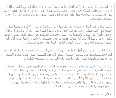 ما التقيتُ جزائريا إلا و شعرتُ أنّ له قرابة بي ، في رسالة عمتي الزهراء من واحتي الوادعة بصحراء الجنوب .. ولا تزال تبحث عن شقيقها.. لمعالي القنصل الجزائري بسبها .. سلاما واحتراما .. أود أن أعرض أمامكم معضلتي : – فقد تقطعت بي الأسباب نحو إدراك أخي (محمد .. ) الذي التحق بصفوف جبهة التحرير الوطني الجزائري عام (1956ف) ، والذي لازالت محفورة في الذاكرة تلك العبارة التي اختتم بها رسالته الأخيرة للأسرة . يقول فيها :” يا أبى ويا أمي أريدكم أن تكونوا راضين عني ، دنيا وآخرة ، أأسف جدا أنني لا استطيع أن اسمع عنكم أي شيء ، أما أنتم فلا بد أن تسمعوا عني شيئا ولو طال الزمن “.. والآن وقد طال الزمن ، وبلغت من الكبر عتيا ، لم تنطفي حيرتي ولهفتي علي أخي شقيقي بعد ، كيف هو ، وأين هو ، وماهي أخباره . ما إذا كان حيا أم ميتا ، ما إذا كان له أبناء ، وكيف انتهي به المطاف .