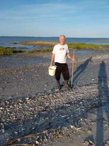 When he’s done clamming, he looks like a slightly remorseful- but proud -three-year-old boy fresh from a mud puddle. The other day, in all his mud-bespeckled glory, still wearing the grimy rubber boots, he grabbed his white, plastic bucket of unmwashed, still very much alive clams and strode purposefully toward a neighbor walking her two little purse-dog Pomeranians in the street in front of our house.