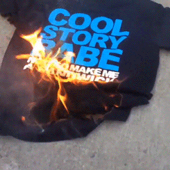 From what I recall the guy burning it is a model who had to wear that shirt for a shoot, and once it was done he burned the stupid thing.