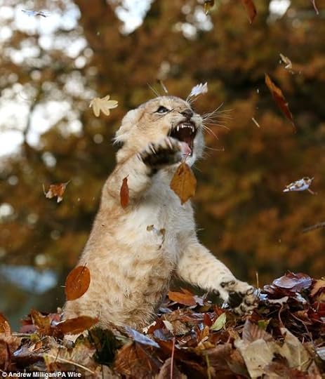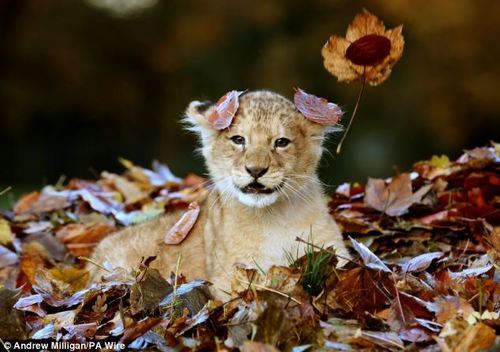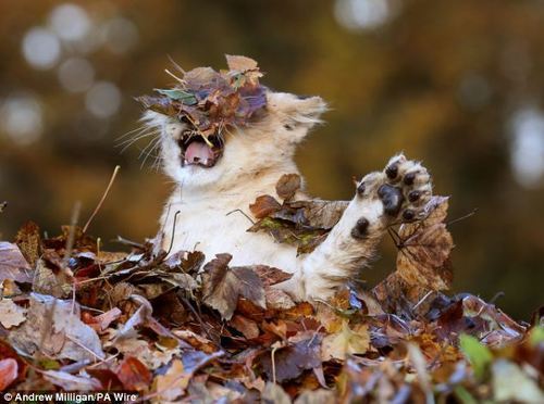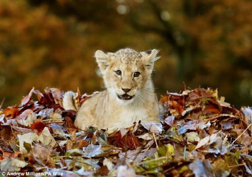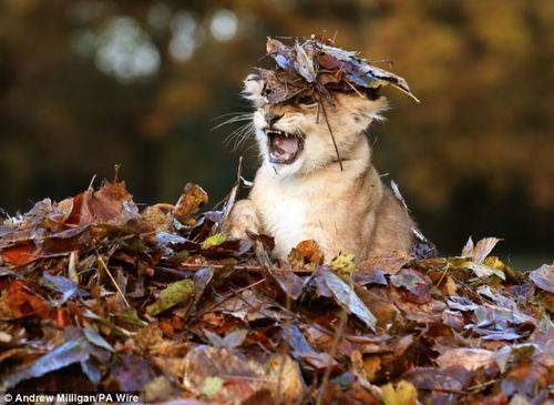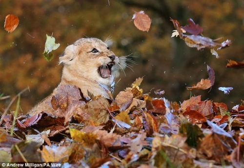 Frolicking in the autumn leaves, this little lion cub is having the time of her life as she excitedly plays in her enclosure.