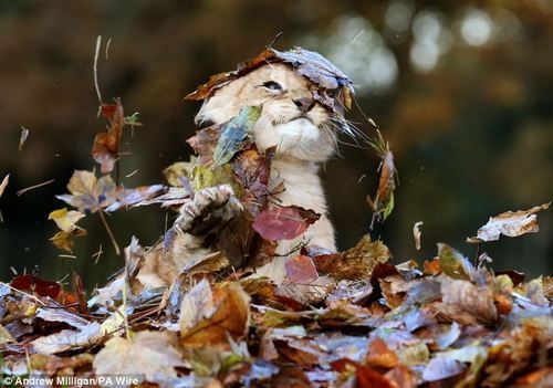 Staff at the Blair Drummond Safari Park, near Stirling, Scotland, had been raking up the leaves to keep the attraction tidy, when Karis’s keeper Brian Reid realised that his little charge might enjoy playing in them and moved the pile into her enclosure.