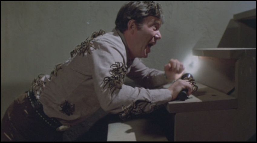 In this small tableau (SPOILER ALERT), the villain has been unveiled as being a giant spider (or something so akin in form that our tiny human minds fill in the blanks lest they be overwhelmed by the unnameable horror that confronts them). It turns out that the beast is pregnant, and has laid eggs throughout its subterranean lair. One of our heroes takes it upon himself to smash every egg, which unleashes a slightly squashed (but still abnormally large) baby spider which the hero is obliged to finish off with the heel of his shoe. There are many, many eggs, and soon the hero has run out of matches to light his way with, and he continues his unholy and gruesome task in the dark, feeling out and squishing giant spiders with his gore-soaked feet.