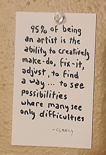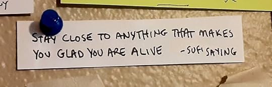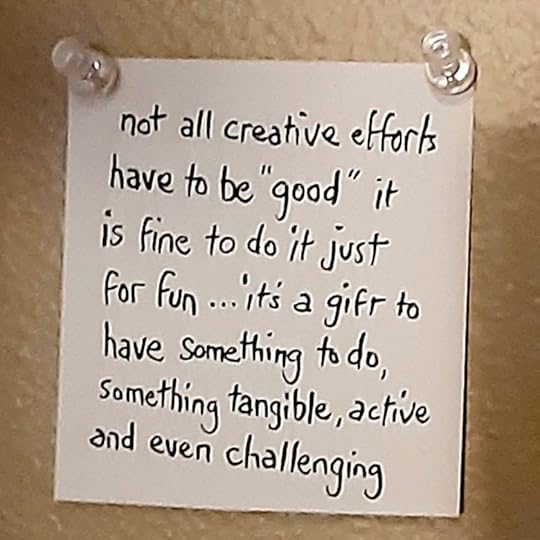 As I alluded in my last post life and art are correlated. In the comments Sherri said it’s like a braid. That’s certainly true for me; life, creative projects and self-care weave together. It’s not a work slash life balance so much as it is what can I do that makes both life and creativity sustainable and as fun as possible? Art and life can teach each other what they need when I’m listening to what makes me glad to be alive at that moment. The thumbtacked quote below is one of my favorites.
