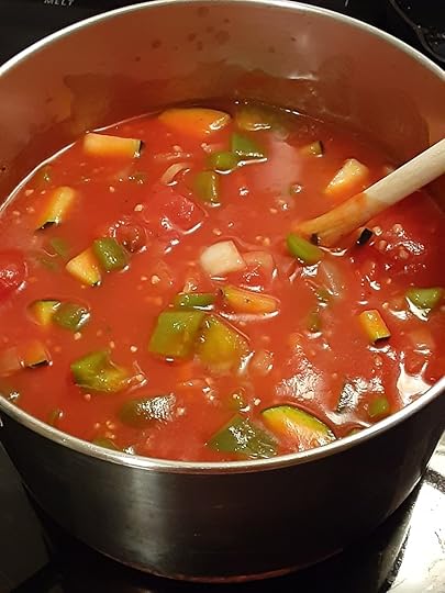 Since we’re hand washing dishes until the new dishwasher is installed I made my homemade simple sauce (recipe card here) and added chunky veggies – zucchini, onion, bell peppers – it was very good over pasta! Several meals were had with easy clean up – just the pot I boiled pasta in and the bowls and forks we ate with! The sauce was reheated in the pot it was original cooked in.
