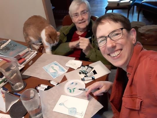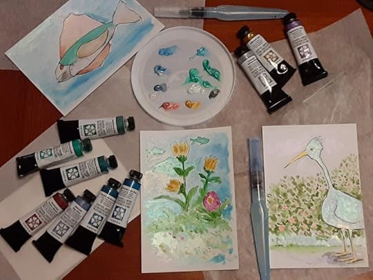… and it was good to practice. Just for fun we got some Daniel Smith watercolors that have shiny aspects; interference, iridescent and duochrom to the colors – and both of us played with them on watercolor paper. Taking time to play is important especially in stressful times. The cat helps too.