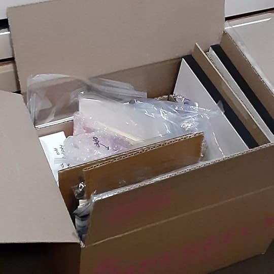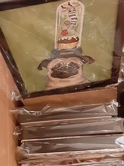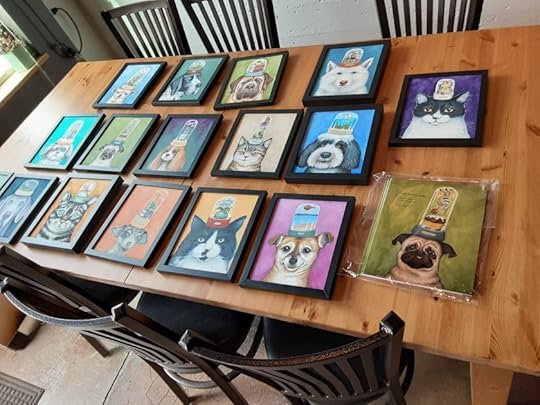 Here’s a photo of some of my art spread out on a table ready to be hung for display. A package of books is ready too.