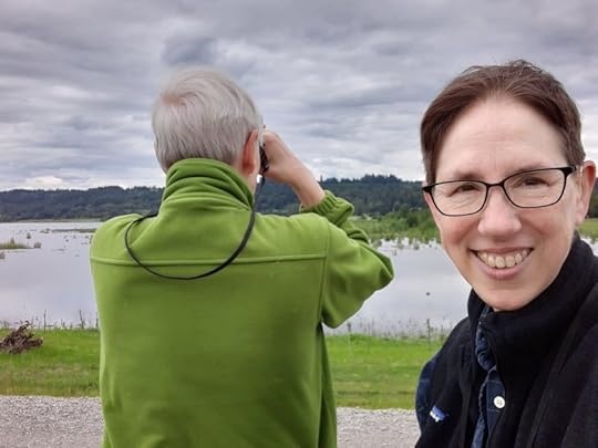 Besides musing about words my wife and I went for a walk in the Steigerwald Wildlife Refuge with our binoculars. I saw the purple blue grey colors of a great blue heron up close! I didn’t realize the extent of the purplish tints to the heron feathers. We saw lots of other wildlife too – including smiling friendly humans!