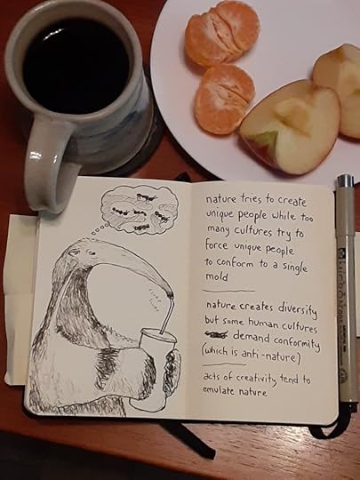 In a prior post I wrote about sharing the correlation I see between art and mental health. Writing and drawing your thoughts and feelings can help you check in with yourself. It’s a way of caring about and listening to your innermost self. Beyond any therapeutic benefits a habit of writing and drawing is also intelligence at play. Play is essential to mental health and not valued nearly enough… but I digress. Reading books and viewing the art others have made serves both of the therapy and play purposes too. Telling and showing more of my own work, my own intelligence at play, in my sketchbook is one way I can think of to share this correlation I see. That’s part of why I’ve begun A.M. Sketching anyway. (Btw this week there was a featured bug…)